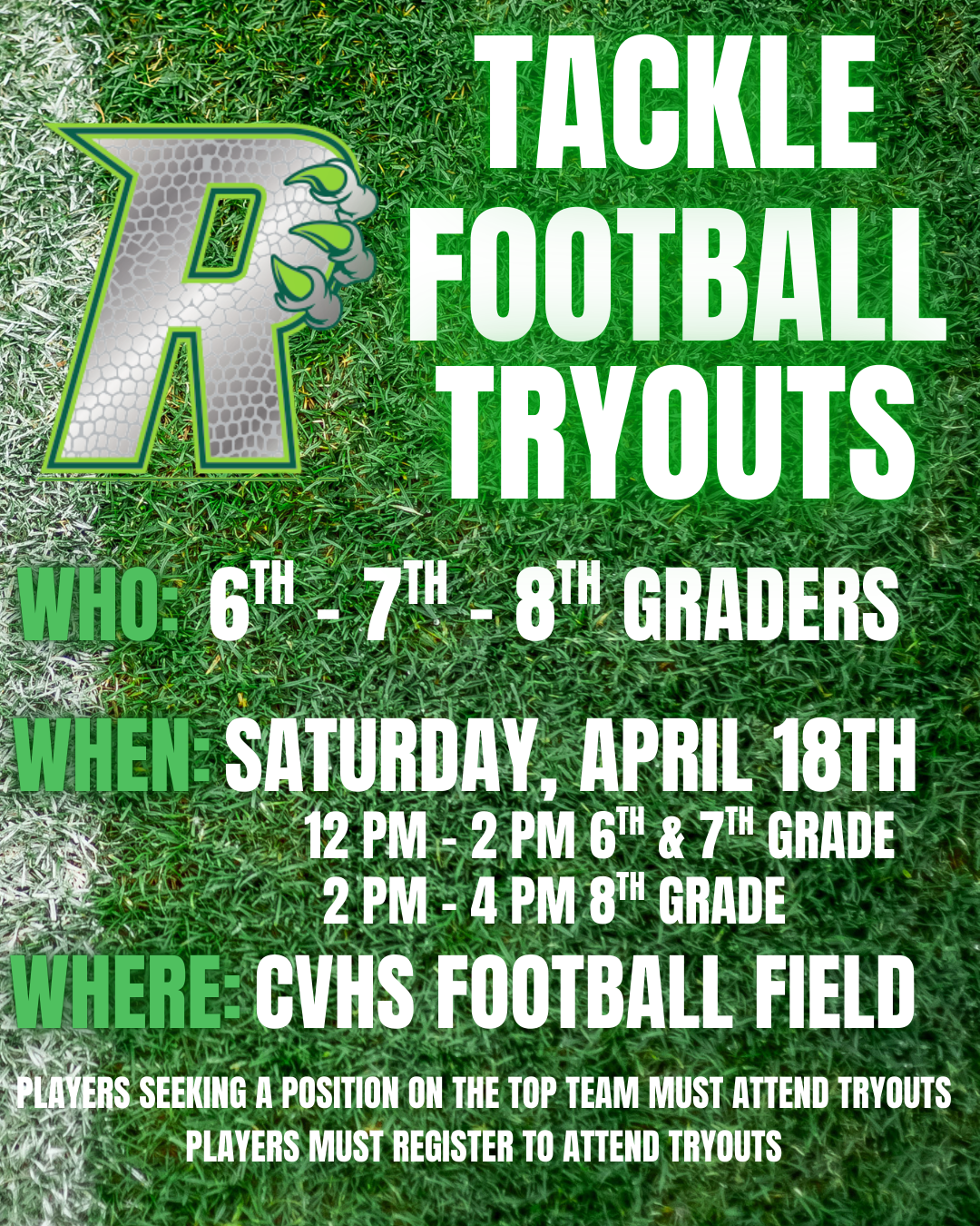 The AYL has moved away from AFC and NFC divisions. Every team per age group is seeded from 1-however many teams are in that particular age group. Thus, there are no more "NFC Tryouts." Now there are CLUB Tryouts for each age group (depending on if that age group needs to hold a tryout). Some seasons NOT ALL AGE GROUPS WILL HAVE TRYOUTS. These tryouts are for players within each age group wanting to compete with the highest seeded team. Every player participating in Club Tryouts must be registered. To register please go to the registration tab on the main Raptors Football page. You can also find more information under the Club Tryouts tab on the left hand side of the main football page.